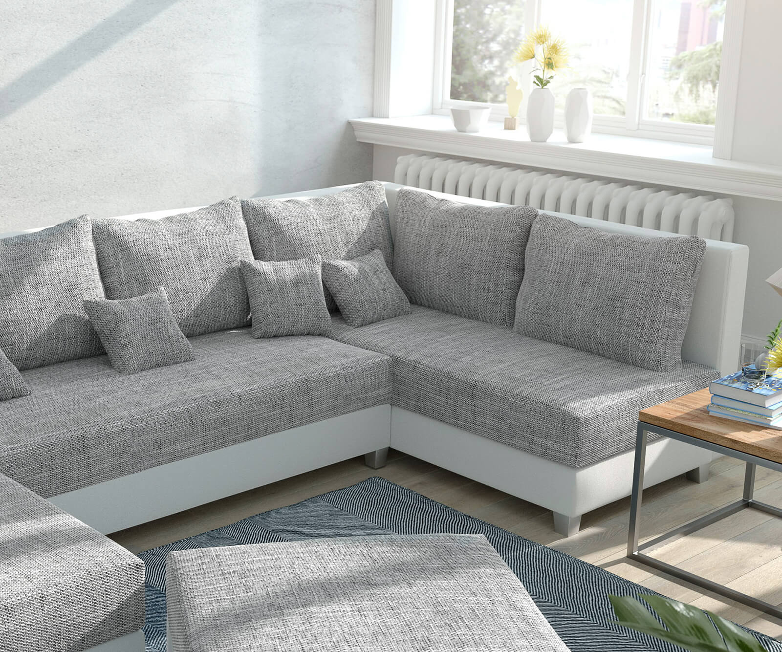 Die wohnlandschaft begeistert durch den bezug in feinstruktur in hellgrau wodurch die garnitur sich in jedem wohnzimmer ideal anpasst und ein wohnliches ambiente vermittelt.