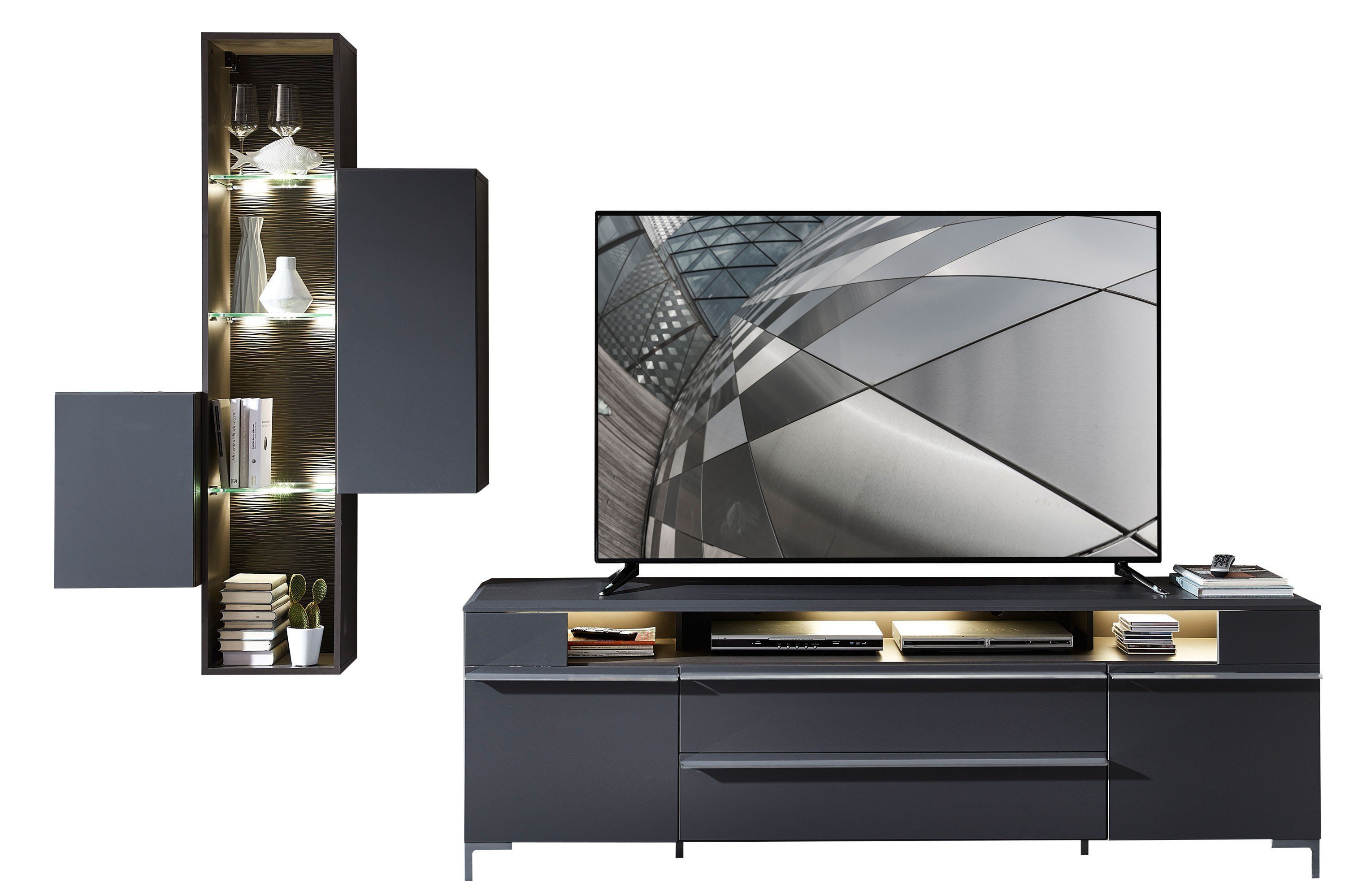 Wohnwand weiss hochglanz tiefgezogen/ graphit geschroppt. Genau aus diesem grund, möchten wir dich vor dem kauf die informationen zu verfügung stellen, damit du keinen fehlkauf tätigst. Moderne wohnwand calabrini i, anbauwand, mediawand, hängevitrine, tv lowboard, wandregal, wohnzimmerschrank, fernsehschrank (mit weißer led beleuchtung, weiß/weiß hochglanz). Oder eine wohnwand ist eine anbauwand aus riegeln und elementen zwischen den riegeln. Eine kombination, welche sich auch ideal einfügt und mit einer lebendigen korpusausführung in driftwood und einer eleganten frontausführung in graphit verzaubert?